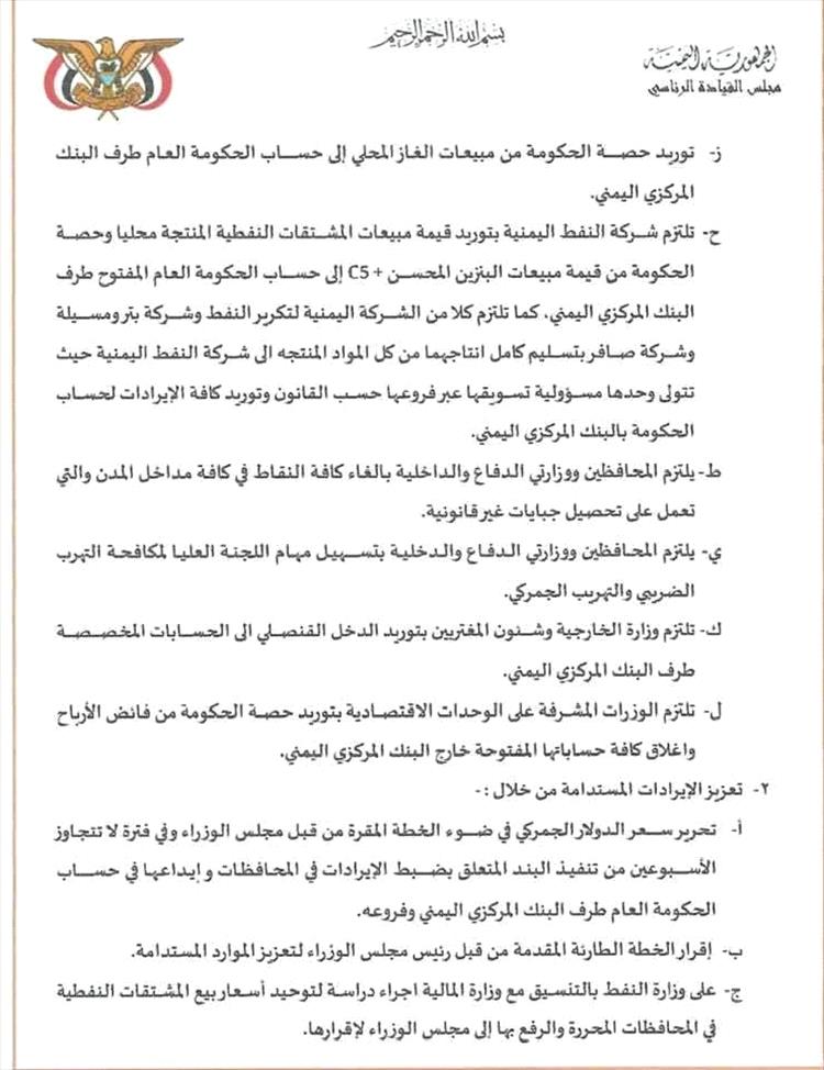 وفي جانب الإيرادات، نص القرار على توريد عائدات مبيعات الغاز المحلي والمشتقات النفطية إلى حساب الحكومة العام، مع إلزام شركة النفط اليمنية والشركات المنتجة بتسليم كامل إنتاجها وتوريد الإيرادات عبر القنوات الرسمية.