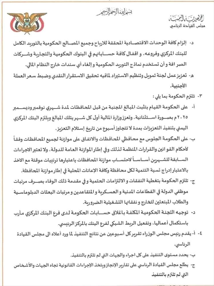 ووجّه المجلس باستكمال إجراءات إغلاق حسابات الحكومة لدى فرع البنك المركزي في مأرب وتفعيل الربط الشبكي مع المركز الرئيسي، إضافة إلى إلزام رئيس الوزراء برفع تقارير دورية كل أسبوعين حول مستوى التنفيذ، مع اتخاذ إجراءات قانونية بحق الجهات غير الملتزمة.