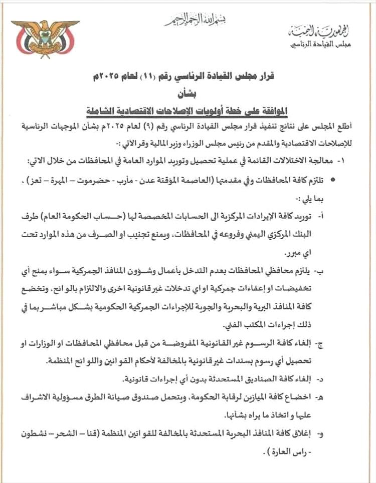 أقرّ مجلس القيادة الرئاسي، قراراً جديداً رقم (11) لعام 2025م، بشأن الموافقة على خطة أولويات الإصلاحات الاقتصادية الشاملة، وذلك عقب اطلاعه على نتائج تنفيذ القرار السابق رقم (9) الخاص بالموجهات الرئاسية للإصلاحات الاقتصادية، والمقدم من رئيس مجلس الوزراء وزير المالية.