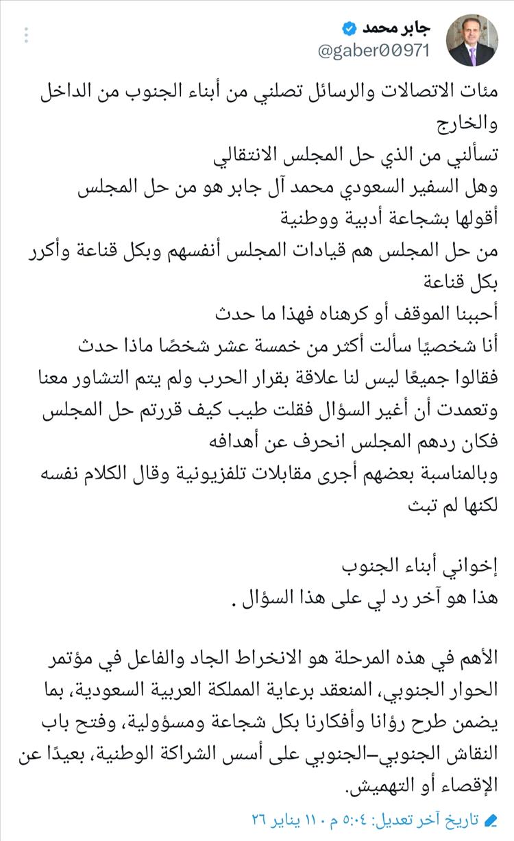 وأوضح جابر محمد، في تغريدة نشرها على منصة إكس ، أنه تلقى مئات الاتصالات والرسائل من أبناء الجنوب في الداخل والخارج، تساءلت عمّن اتخذ قرار حل المجلس الانتقالي، وما إذا كان السفير السعودي لدى اليمن محمد آل جابر طرفاً في ذلك.
